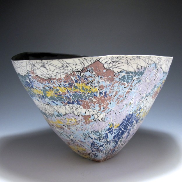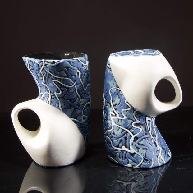 In my recent work I have been exploring colored slips, experimenting with methods of manipulating the physical characteristics of deflocculated slip, and the surfaces altered slips produce when be applied to a mold. The technique is not slip casting or hand-building, or press molding, the forming process has elements of each, the common thread is the use of plaster forms the clay is applied to.